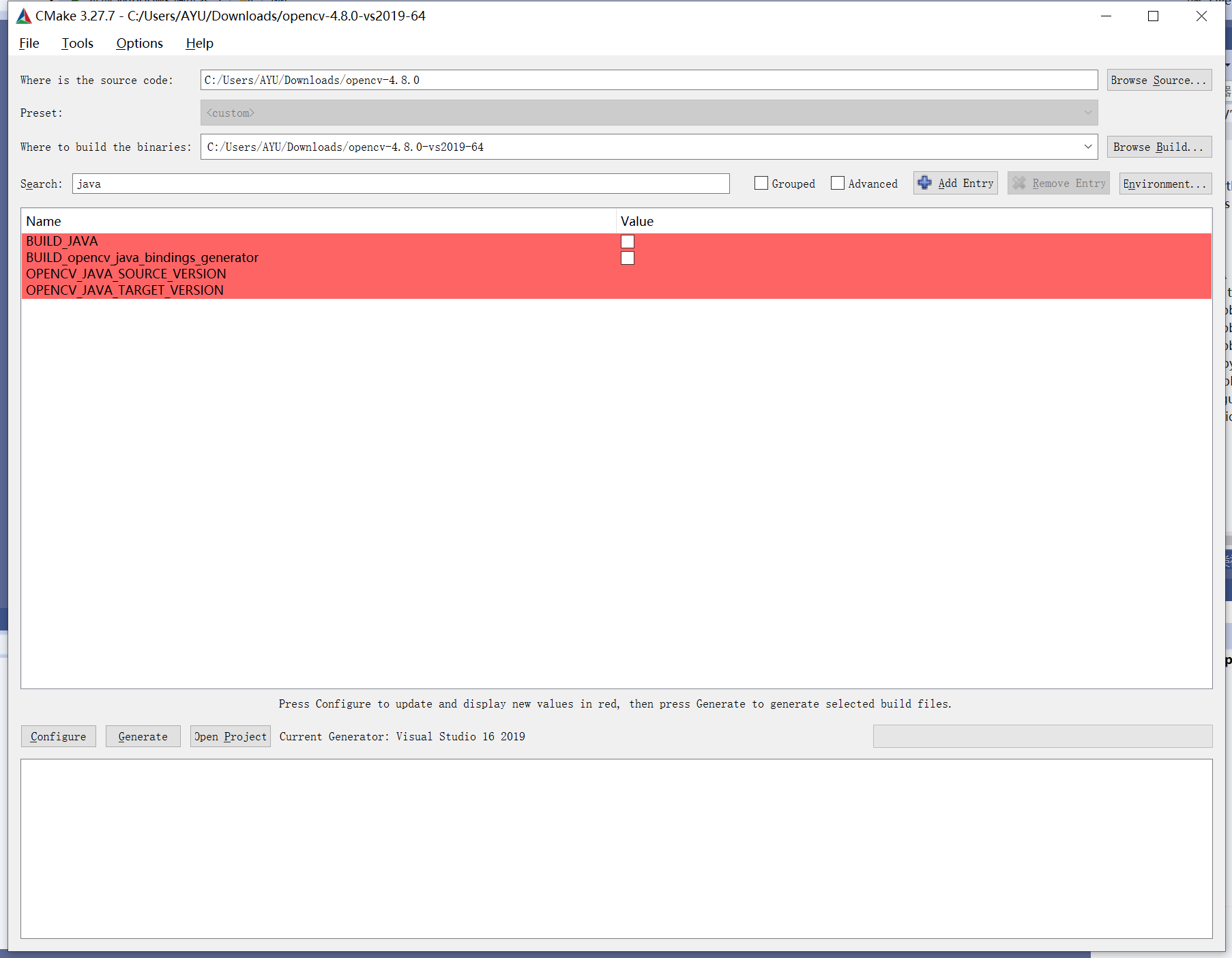 - 打开cmake,where is the source code是opencv sources(博主是opencv-4.8.0)的文件夹位置,where to build the binaries是编译opencv保存的文件夹位置(自定义),在左下角第一次点击configure。