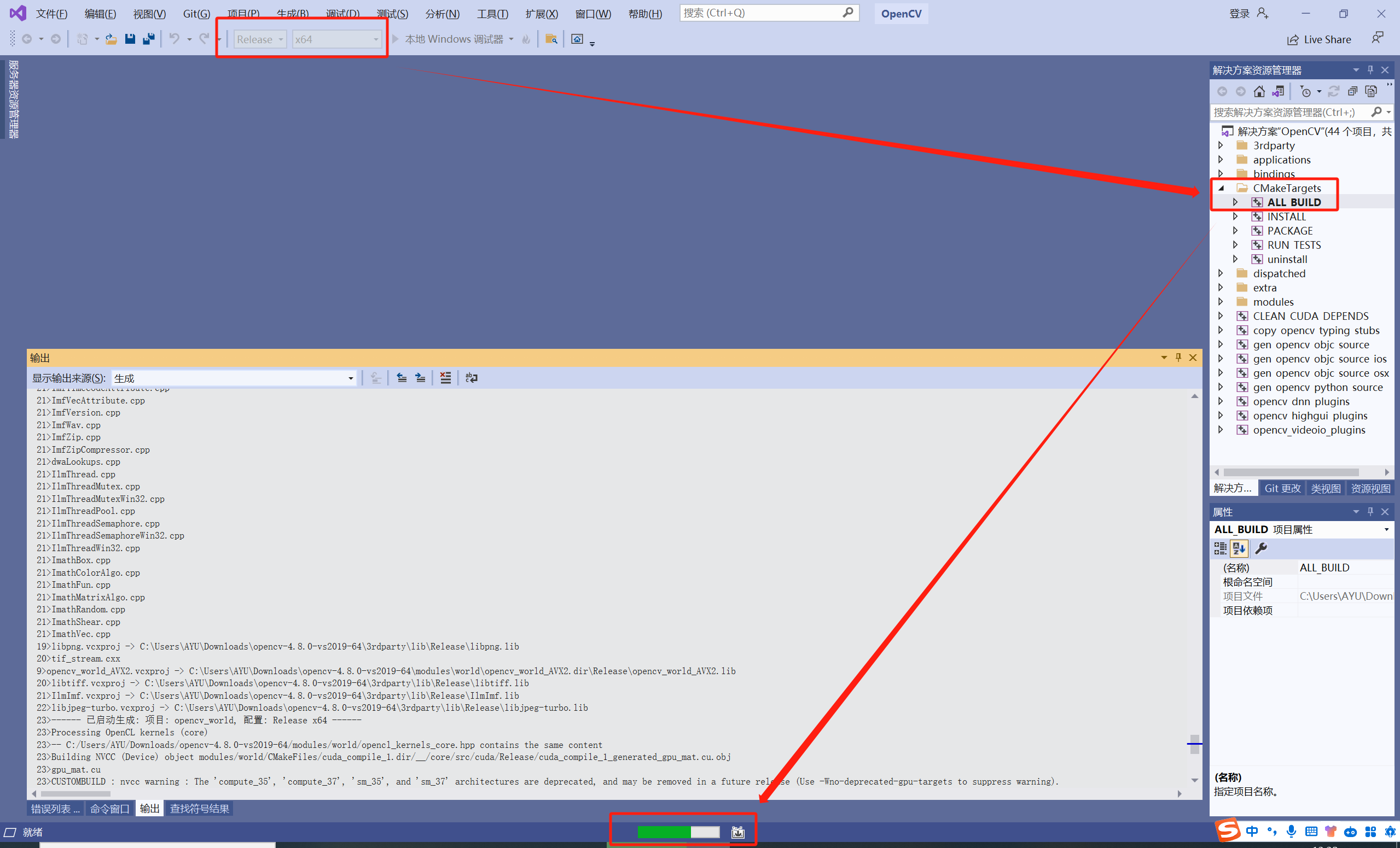 - 使用vs2019 (以管理员方式运行) 打开刚刚编译工程opencv.sln,在release|x64模式下,在解决方案资源管理器—>cmaketargets—>右键点击all_build–>生成。