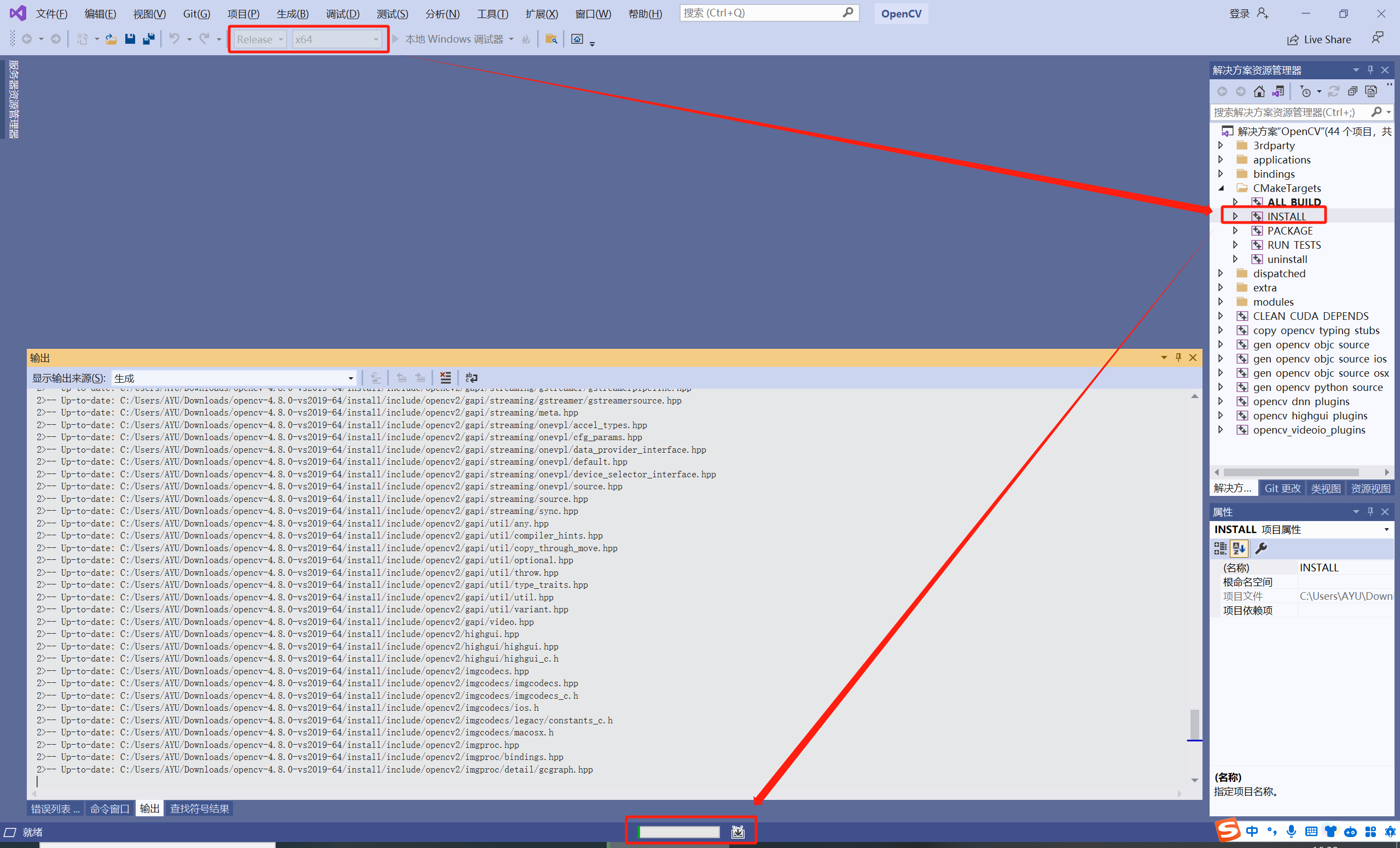 - 同样在release|x64模式下,在解决方案资源管理器—>cmaketargets—>右键点击install–>生成。