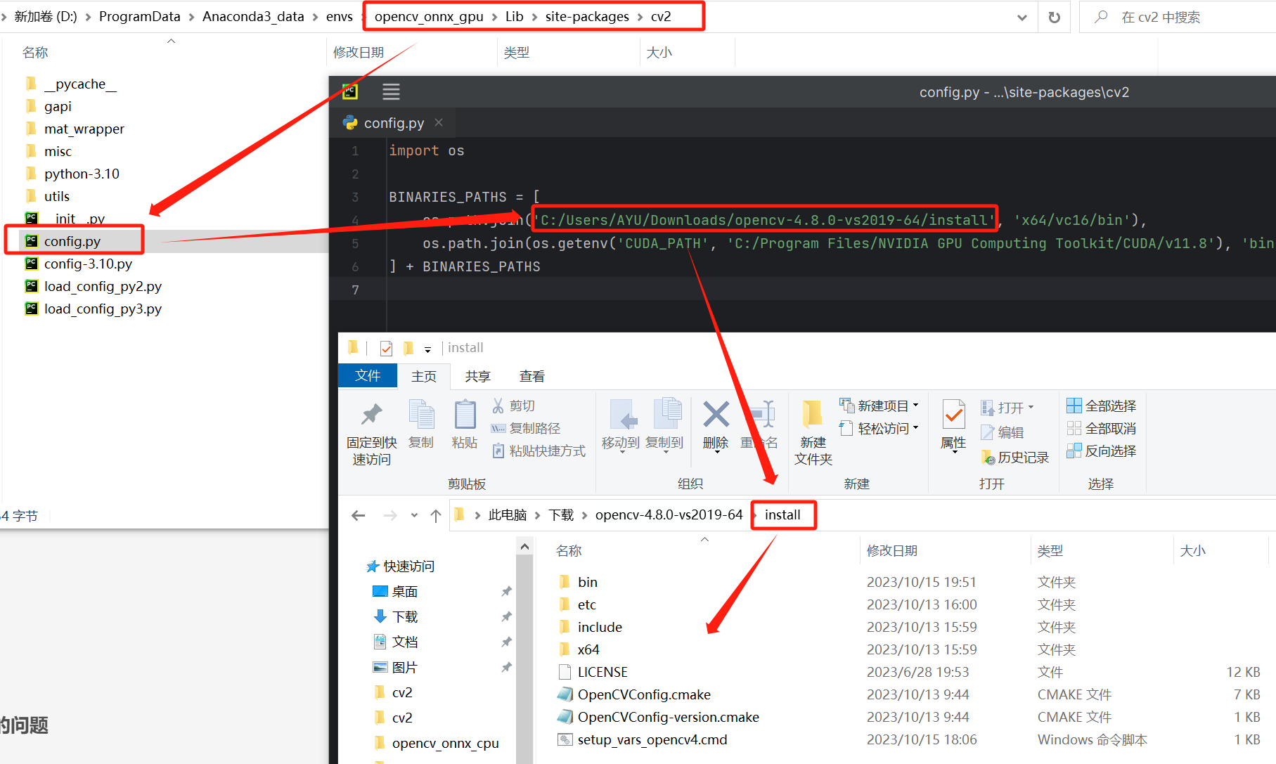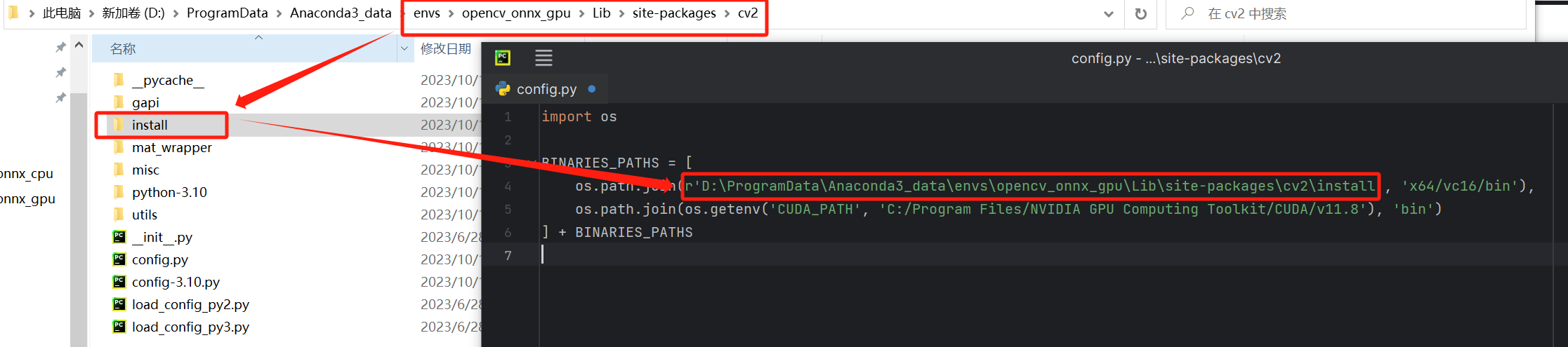 进入cv2目录打开config.py可以看到虚拟环境opencv_onnx_gpu依赖于cmake编译的opencv(where to build the binaries)。
