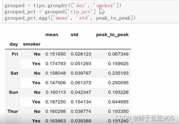 关键技术:对于由dataframe产生的groupby对象,如果用一个(单个字符串)或一组(字符串数组)列名对其进行索引,就能实现选取部分列进行聚合的目的。