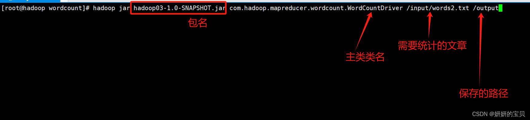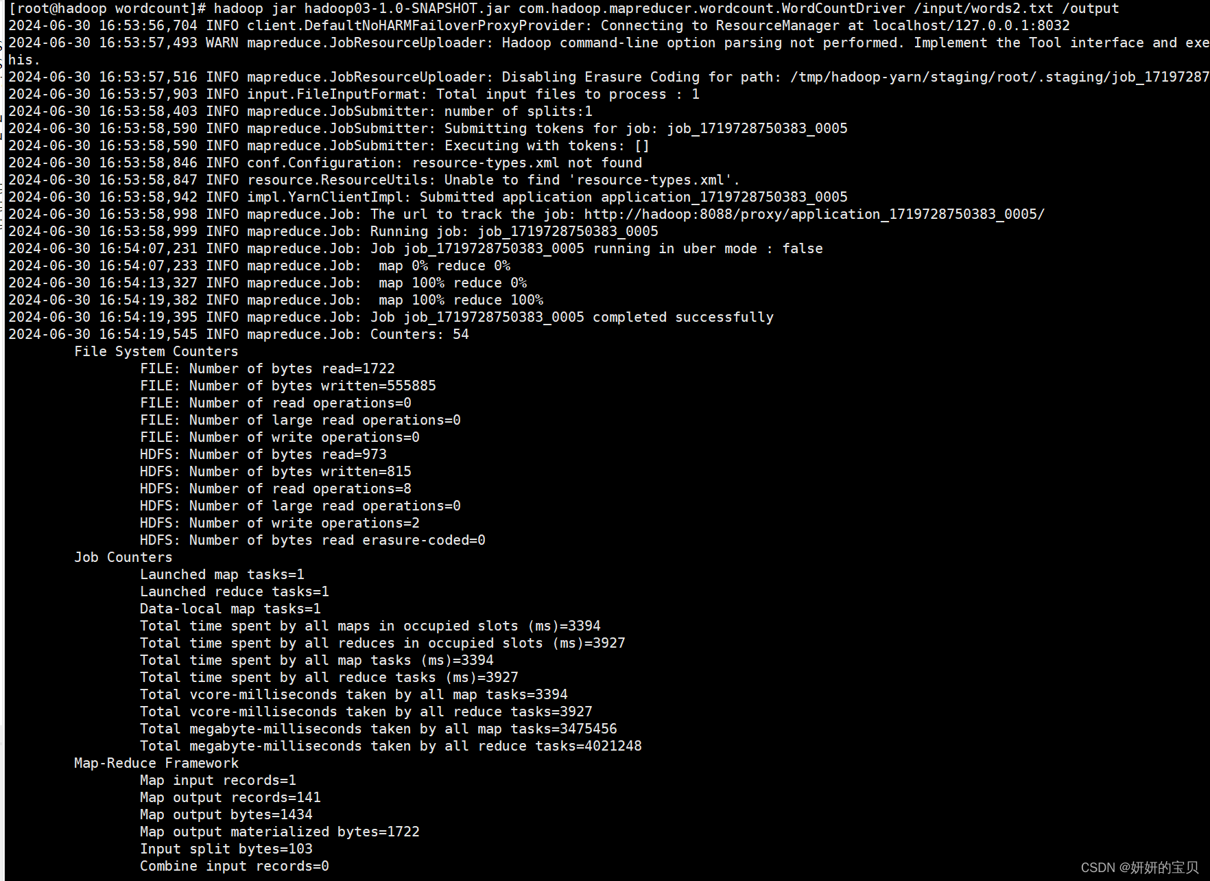 [root@hadoop wordcount]# hadoop jar hadoop03-1.0-snapshot.jar com.hadoop.mapreducer.wordcount.wordcountdriver /input/words2.txt /output