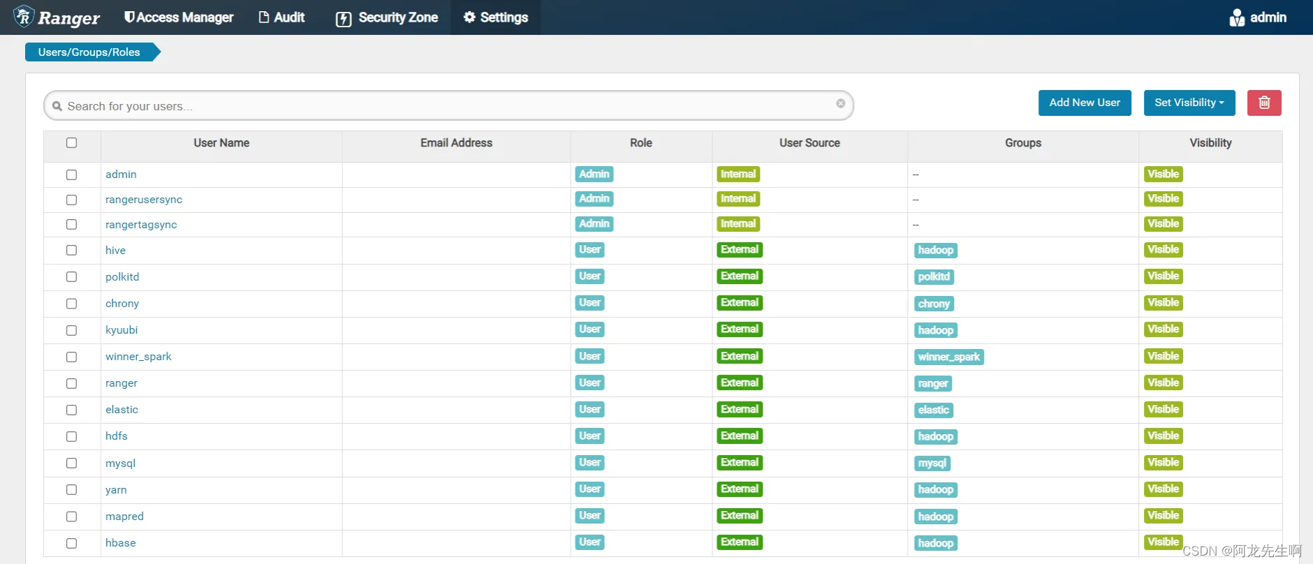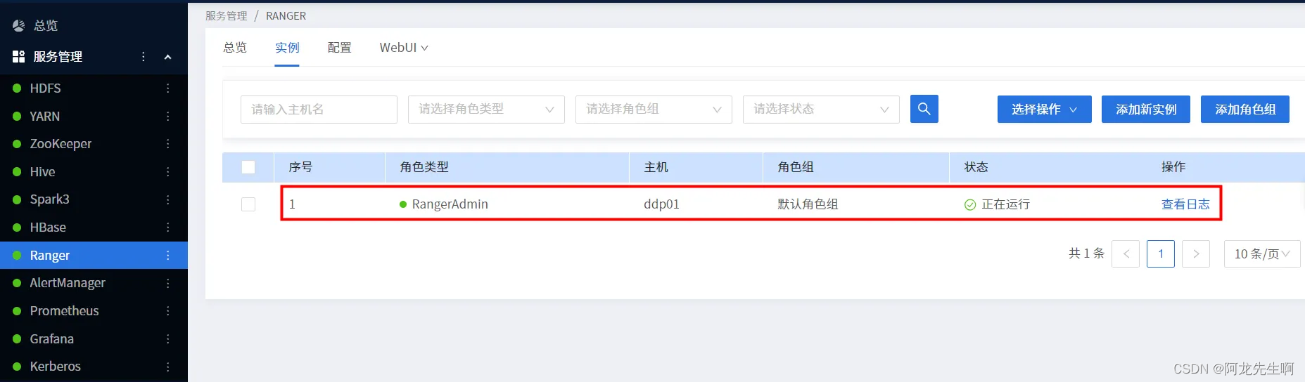 如下是ddp1.2.1默认有的rangeradmin, 我们需要将rangerusersync整合进来 ,实现将linux机器上的用户和组信息同步到rangeradmin的数据库中进行管理。