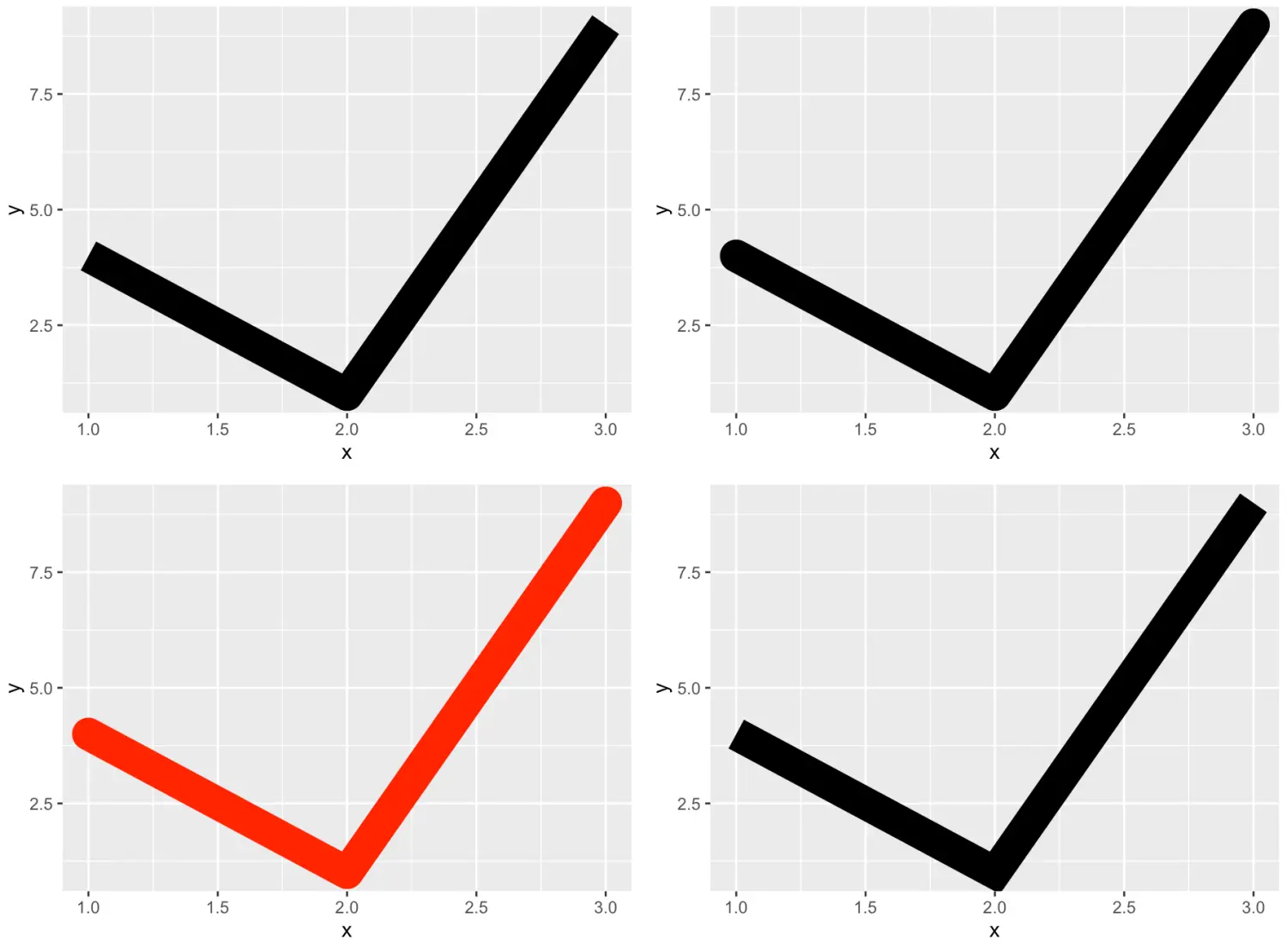 linetype:线条类型size:线条大小lineend:线端点样式:round,butt,squarelinejoin:线连接点样式:round,mitre,bevelarrow:使用grid::arrow()函数设置箭头样式