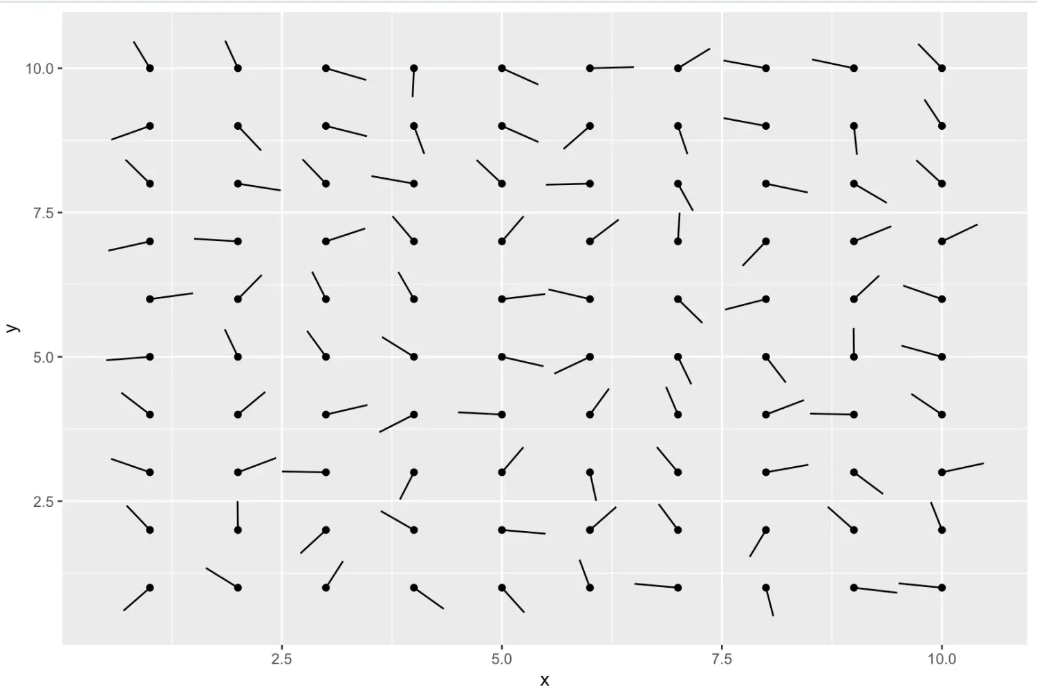 而 geom_spoke 是由坐标点 (x, y) 以及角度 (angle) 和 半径 (radius) 指定的线段