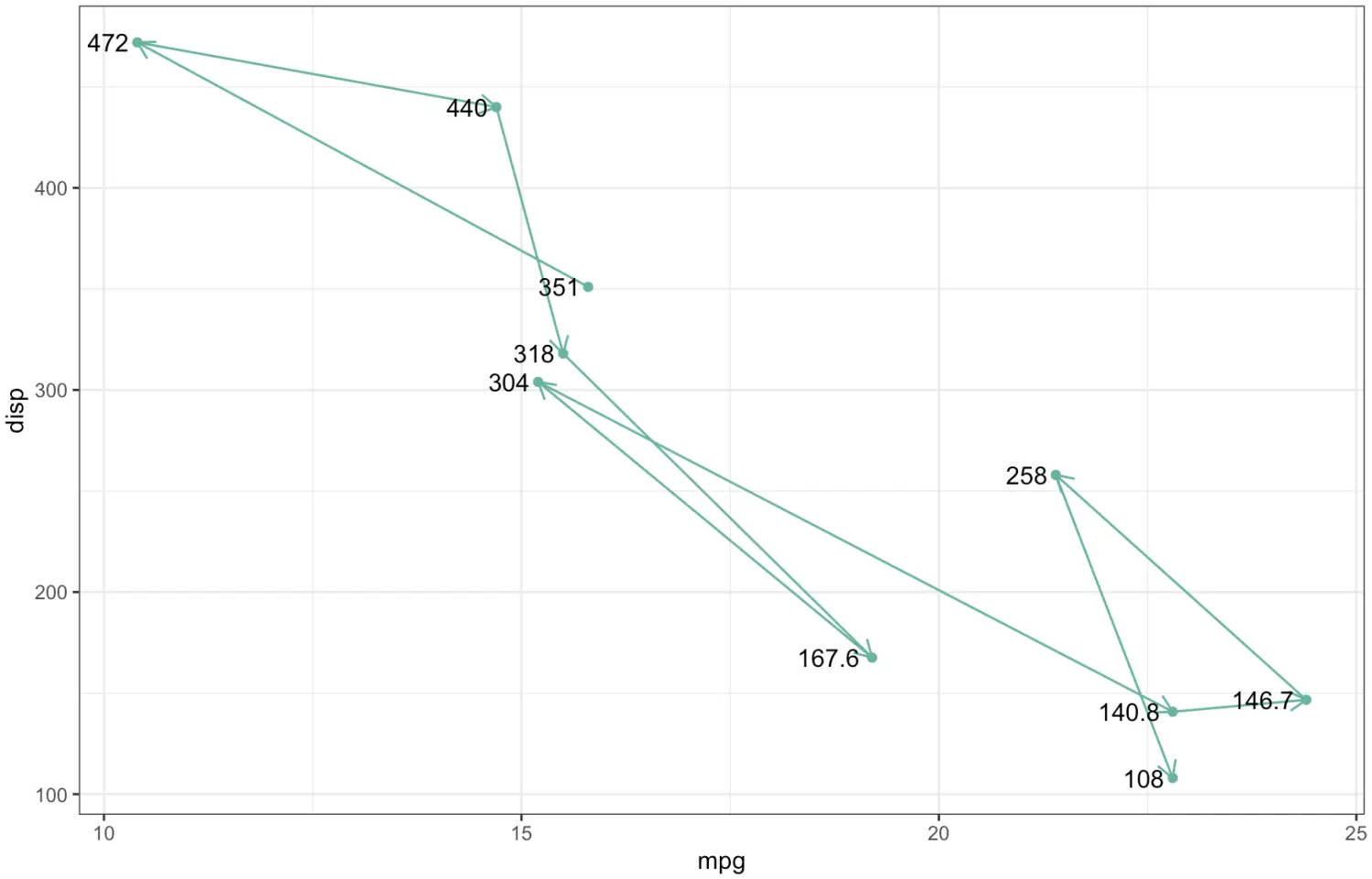 geom_segment(aes(xend = c(tail(mpg, n=-1), na),