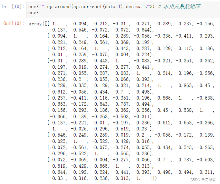 covx = np.around(np.corrcoef(data.t),decimals=3) # 求相关系数矩阵