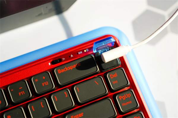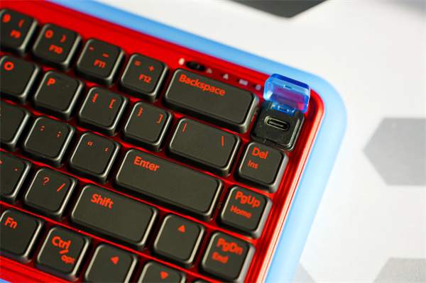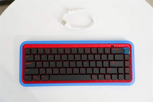 杜伽s230的正面设计亮点无疑是其右上角的type-c接口。这款键盘巧妙地将接口与整体设计融为一体,并为其配备了一个与按键持平的透明外盖。这样的设计不仅美观,更能有效防止水和灰尘的侵入。为配合这一设计,数据线的插头也经过特殊处理,呈现出弯折的形状,为用户在充电时提供更多便利。