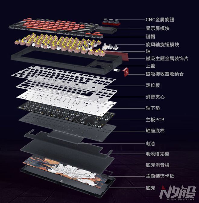 填充方案包含了消音夹心垫,轴下垫,轴座底棉,电池填充棉和底壳消音棉。值得一提的是,其pc定位板采用了1/4单键开槽方案,降低了gk87 pro v2的内胆软弹幅度,按照官方的解释,3角牢固定位,1角开槽是缓震消音。