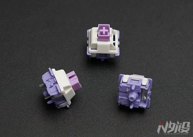 来到强项部分,轴体手感,这键盘搭载了与佳达隆深度定制的极客紫轴(另有极客银轴,凯华loong龙2快银,loong龙2薰衣草),这轴体使用了改性pom轴芯+pom底座+改性合成材料p8上盖。轴芯有增稳壁,灯位是搭桥式,按照惯例陈述下轴体参数,2.0±0.6mm触发行程,3.4mm总行程,压力克数40±10gf,按键寿命8000万次。在顺滑度,杂音控制和稳定性上,这款定制的极客紫轴不错,从边缘位置按压不会有明显的生涩感,总体而言要比不少定制轴体好。
