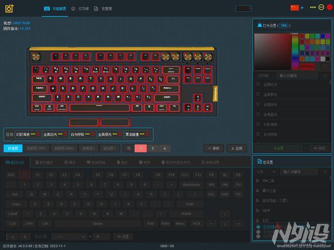 gk6+驱动软件有对应的win版和mac版,双平台通吃。功能都是一样的,支持改键改灯。可以编辑多层,预设了多媒体,系统/网络,甚至是模拟鼠标操作等功能。不过既然配备了分裂式空格键,还有可替换的三向旋钮,gk87 pro的可自定义按键数始终会比传统87多,特别是多出来的一颗空格键,在办公或游戏场景上都有秒用。