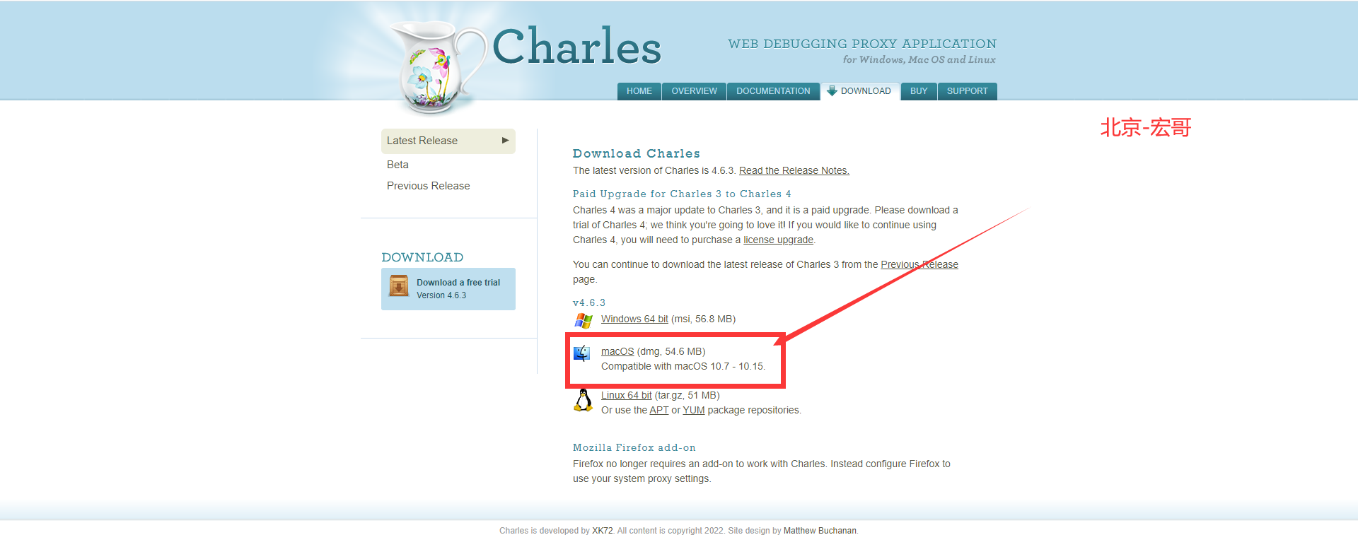 4.选择你对应的操作系统(宏哥这里演示的mac操作系统因此下载的是mac的操作系统安装包),然后点击对应的操作系统的安装包开始下载(这里默认下载的是最新版本的charles),如下图所示: