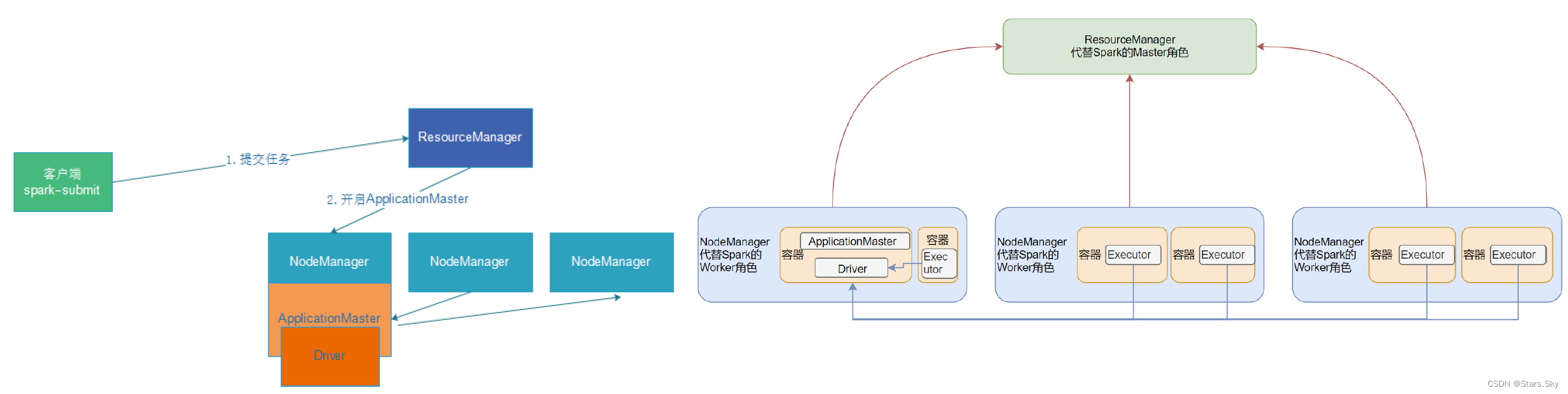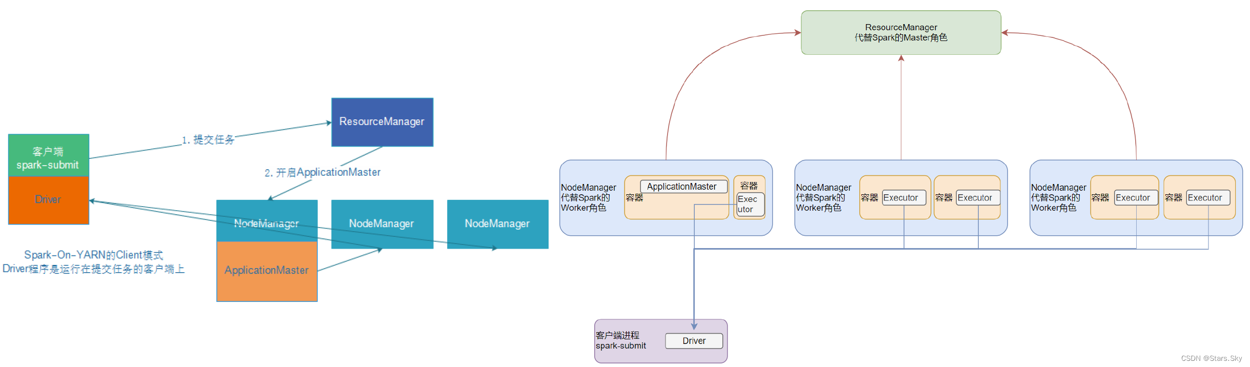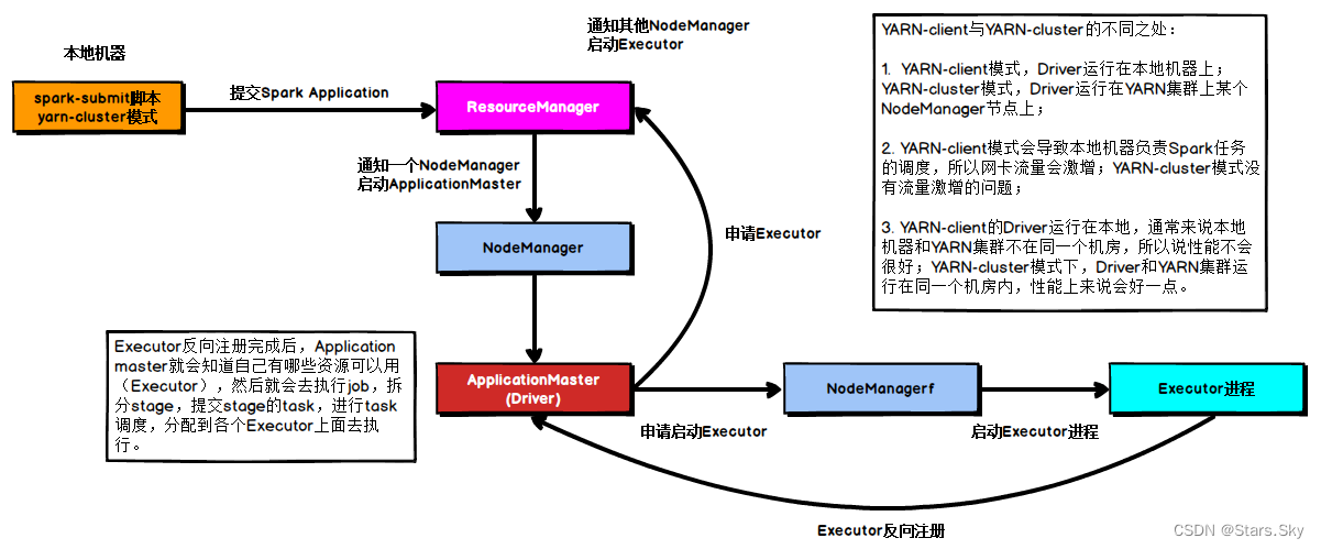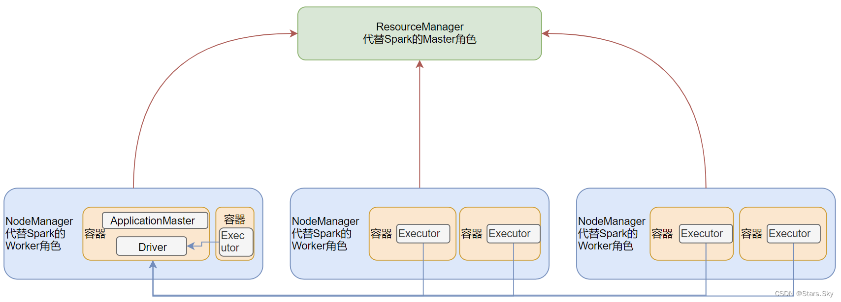 - 真正干活的 executor 运行在 yarn 提供的容器内。