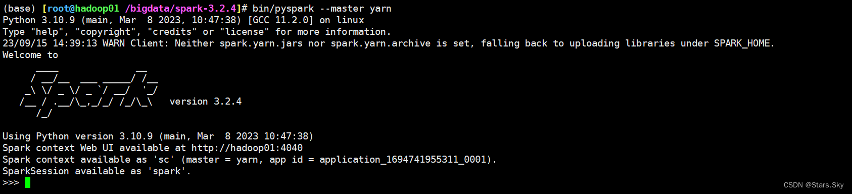 (base) [root@hadoop01 /bigdata/spark-3.2.4]# bin/spark-submit --master yarn --deploy-mode client --driver-memory 512m --executor-memory 512m --num-executors 2 --total-executor-cores 2 /bigdata/spark-3.2.4/examples/src/main/python/pi.py 10