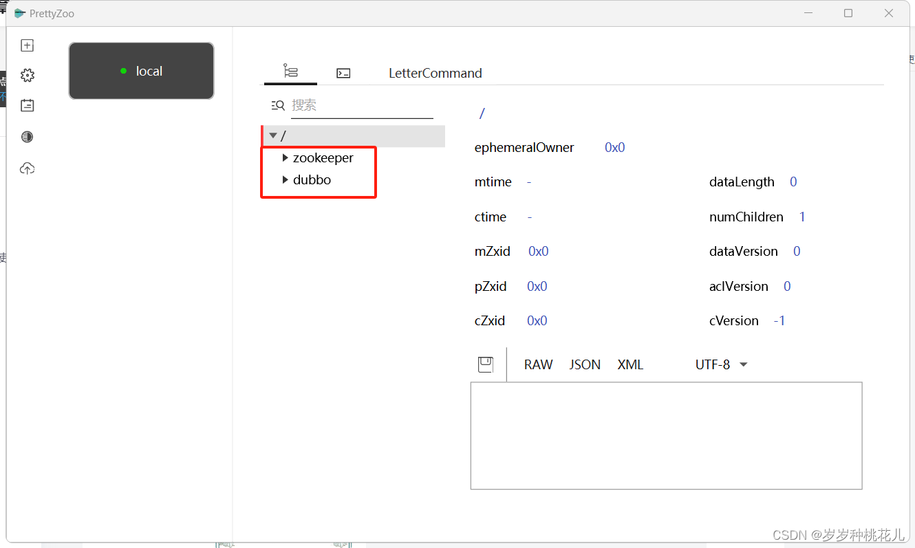 使用我们的prettyzoo可视化工具可以看到zookeeper的服务内容。 当前我们可以清楚的看到在我们的根节点下只有我们一个zookeeper的节点,这是非常正常和干净的。接下来我们启动我们的服务来进行测试。