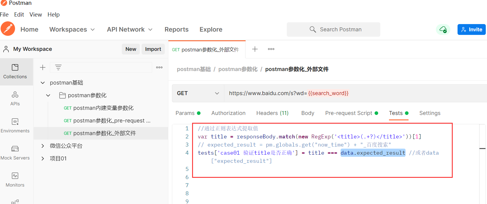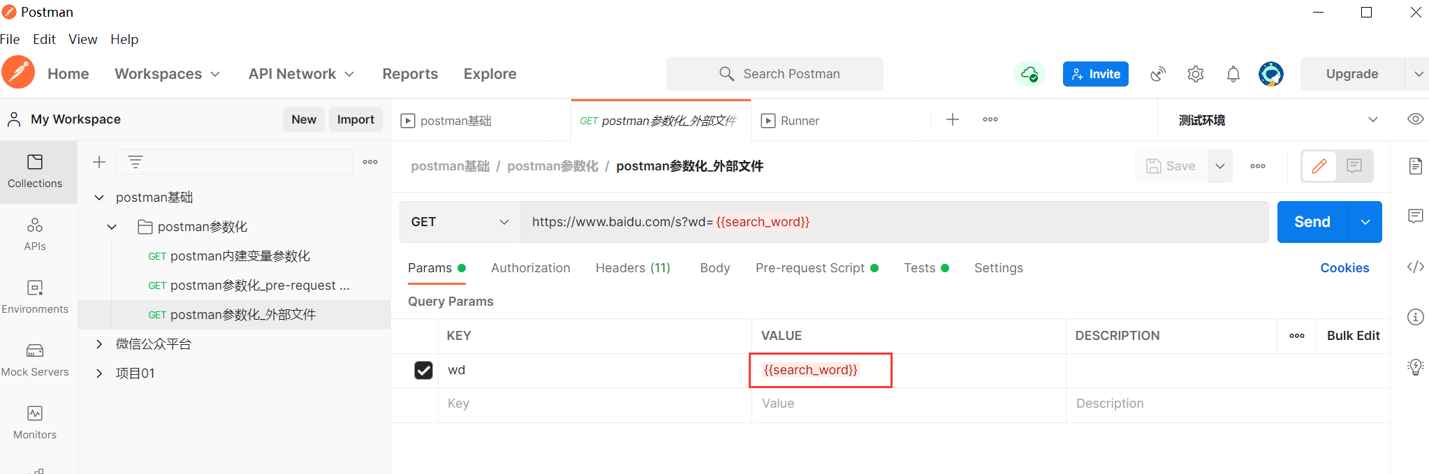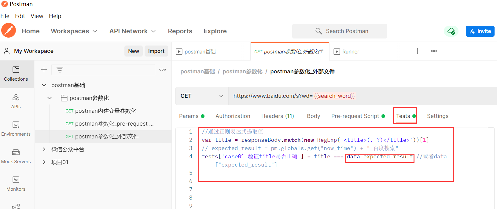 2、在postman中引用变量名,如下图中的百度搜索中wd的参数引入了{{search_word}},tests页签中做断言引用了data.expected_result