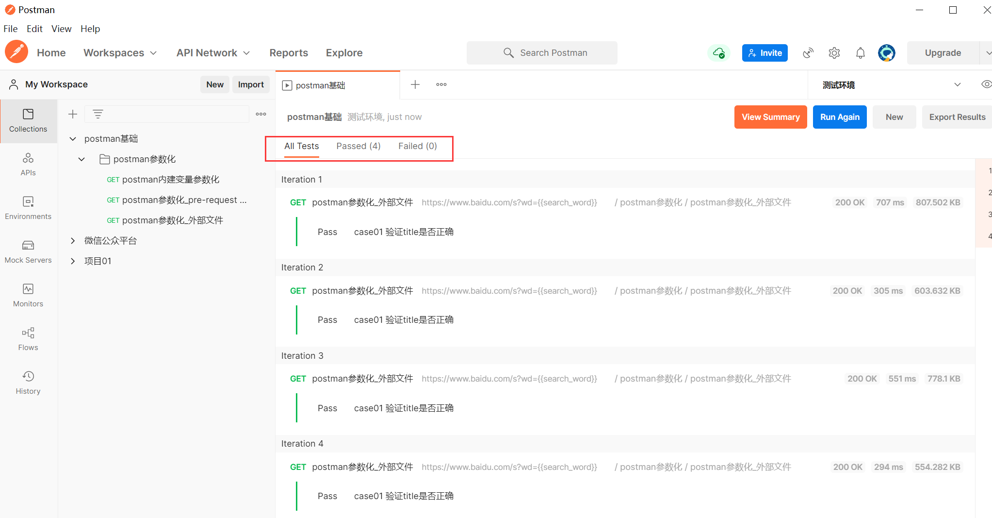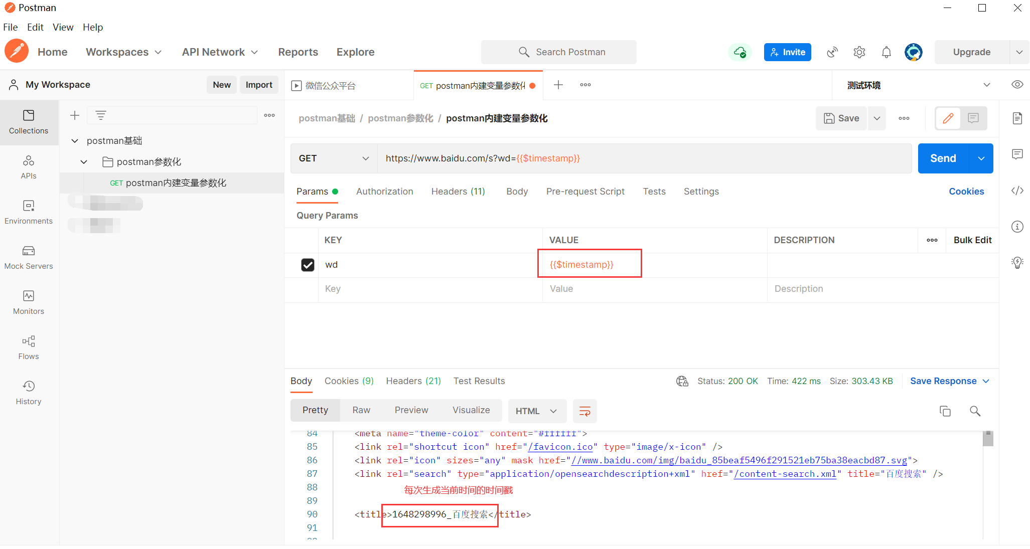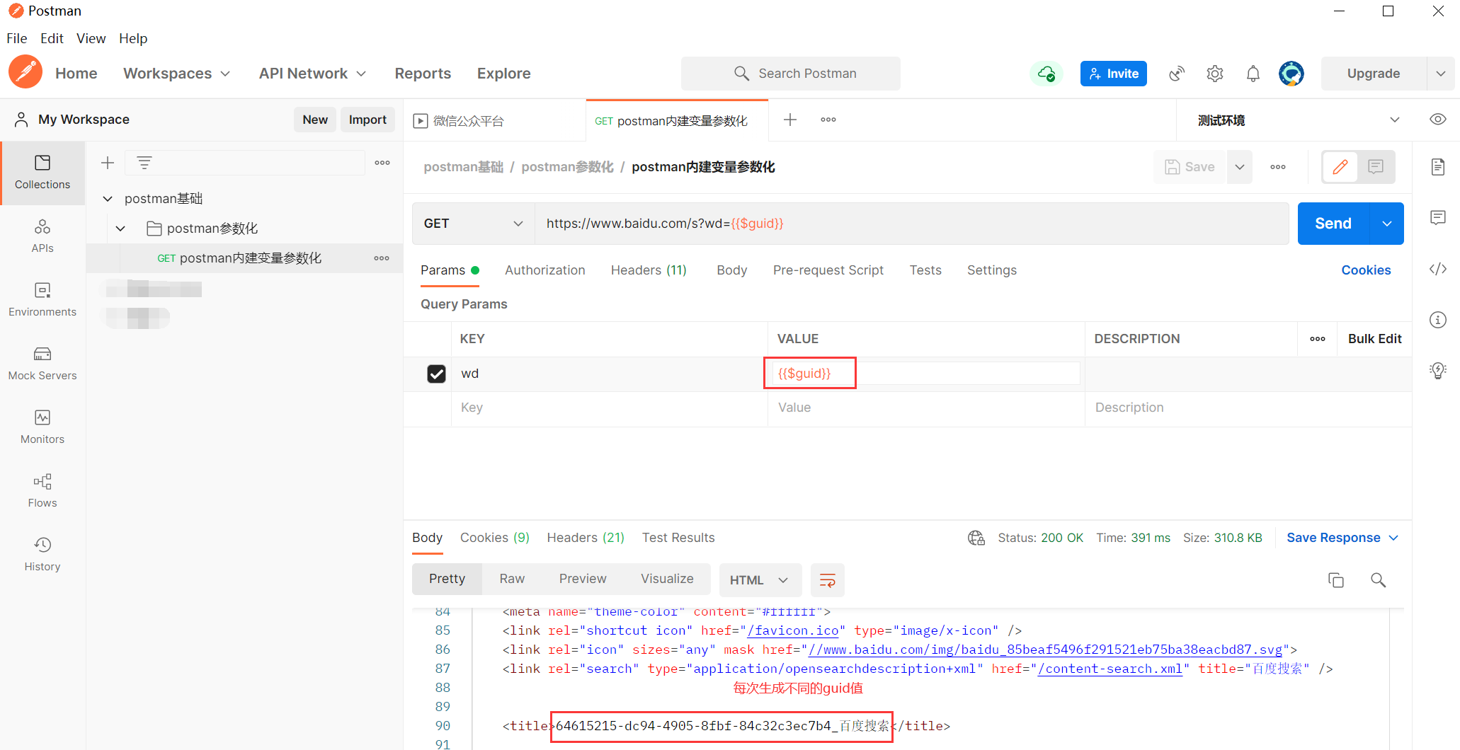 2、在postman中引用变量名,如下图中的百度搜索中wd的参数引入了{{search_word}},tests页签中做断言引用了data.expected_result