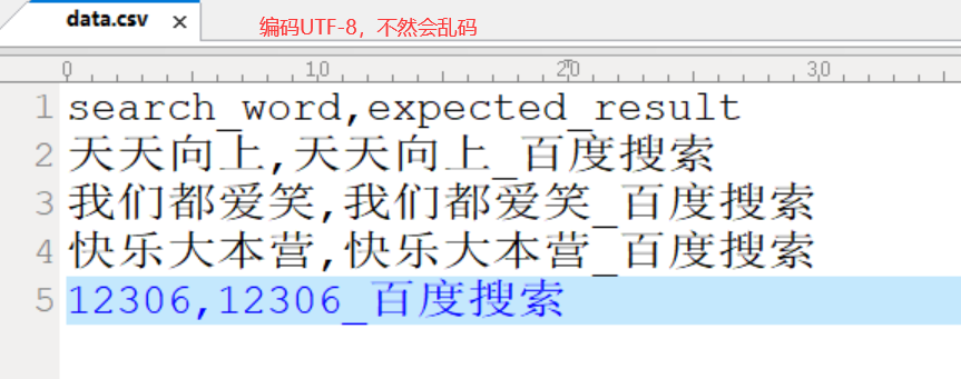 csv文件要在collection runner中工作,第一行必须是在request中要使用的 变量名,每一行是一条用例,并表示一次迭代。