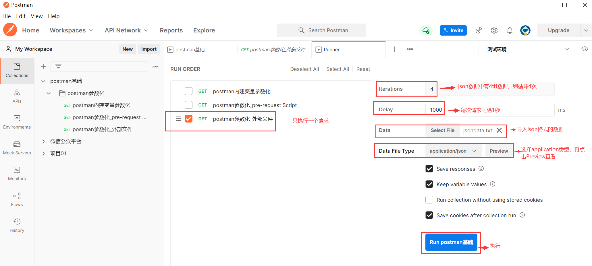 3、打开runner窗口,点击data旁边的select file按钮,导入jsondata参数化文件; 点击data file type类型选择application/json后,点击preview按钮,检查数据正确