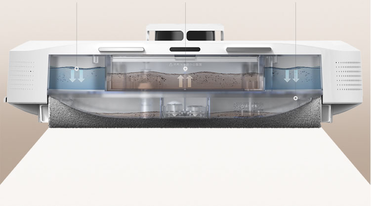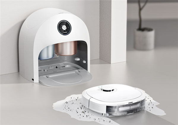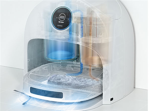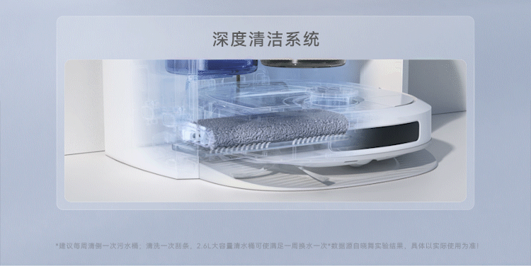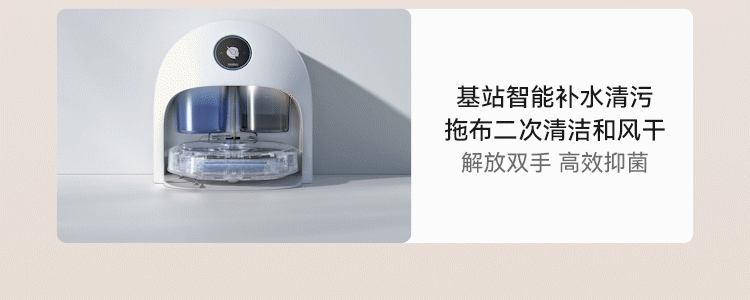 而基站配备的清洁系统由清水、污水桶、拖布清洗装置、风干装置组成。当基站感应到机身清水差不多用尽,污水盒快满时,自动召回机身。首先回收机身上的脏污,然后向拖布喷洒清水并进行高速反转清洗,清洗完成后进行风干,清洁度和风干率高达99%,由此保证了拖布时刻保持干净。