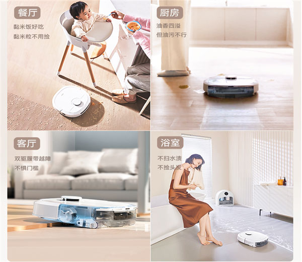 值得一提的是,机器人的运动系统由左右驱动轮、万向轮、履带式拖布组成。在清洁过程中,主机左右驱动轮及万向轮驱动机器人前进、后退、转向,保持平衡。而本次履带式拖布的设计不仅有效提升了清洁效果,更可以化身驱动,辅助机器人爬升越障,让机身全屋穿梭自由,同时满足客厅、卧室、厨房、浴室、阳台等场景清洁需求。