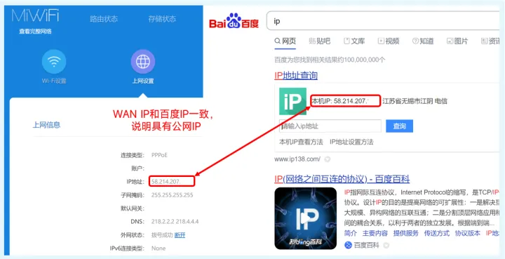 如果不是这四个开头的话,那么再去百度搜索框中输入“ip”两个字母。若光猫中的wan ip和百度显示的ip一致,恭喜你已经拥有公网ip了。