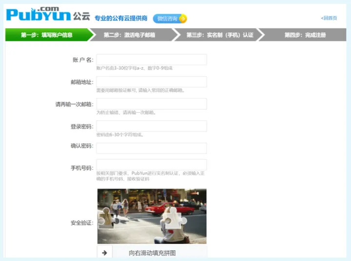 进入公云网站后,首先注册一个账号,过程非常简单,填写用户名,邮箱地址,密码和手机即可。