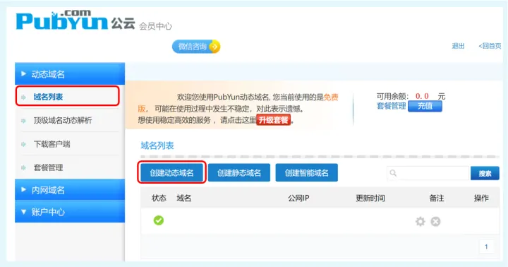 注册完成后,直接登陆,然后在左侧的“域名列表”中,点击“创建动态域名”。