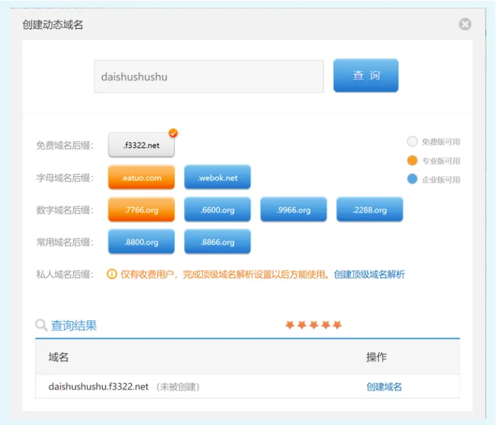 对于一般家庭用户来说,我们选择免费的域名后缀及解析服务即可,前面的域名可以随意编写,只要自己记得住,并且尚未被别人占用就行。