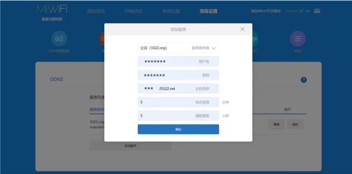 创建完成后,我们就可以使用这个ddns服务了!回到路由器管理页面的ddns设置中,我们将刚刚注册的用户名,密码以及主机名称(也就是刚刚我们注册的域名)填入,然后状态检查时间(每隔多长时间检查ddns)和强制更新时间(每隔多次时间强制更新ddns)按需填入(我这里为了保险起见,填的是5分钟和5小时)。