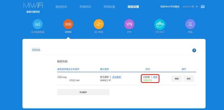 现在开始,如果需要外网访问我们的nas主机,就不再需要ip地址了,而是使用“******.f3322net:端口号”即可。无论公网ip如何变化,都不会造成影响。