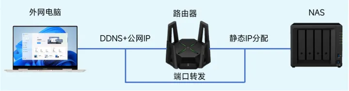 当我们做完上面这五个步骤之后,外网——内网就被完全打通,我们可以顺利从世界上任何一台联网的电脑,访问自己家中的nas服务器了!整条链路的原理如下: