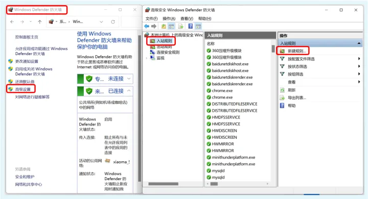 进入控制面板→系统和安全→windows defender防火墙中,点击左侧的“高级设置”,在弹出窗口中选择左侧的“入站规则”,然后点击右侧的“新建规则”。