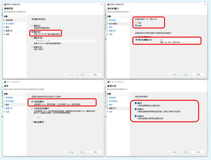 在规则类型页面,我们选择“端口”,点击下一步后,选择端口协议并填入端口号,然后接下来的操作和配置文件维持默认选项,完成后给此规则起一个名字即可。