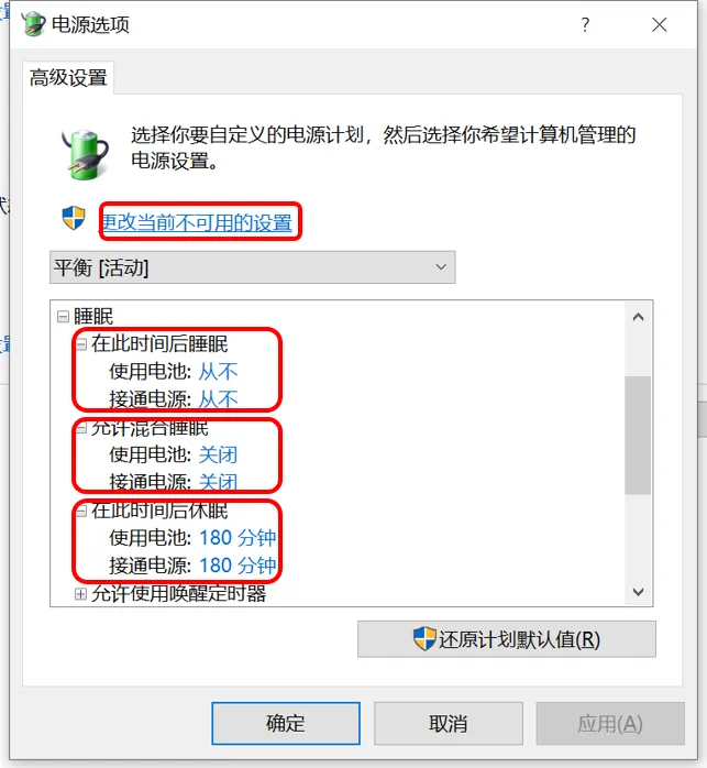 “在此时间后睡眠”和“允许混合睡眠”全部修改为“从不”或“关闭”,然后将“在此时间后休眠”选项,按照自己的需求来进行更改。