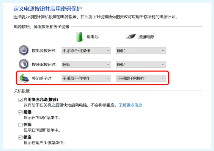 如果是笔记本电脑,但需要合盖使用,还要在电源选项中,将“关闭盖子时”设置为“不采取任何操作”。