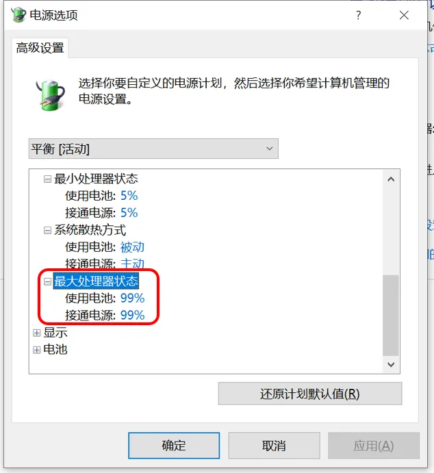 最后,作为nas主机使用的电脑,其实对于性能的要求并不是很高,特别是cpu性能。但有些机型,特别是笔记本,很容易过热。我们在电源选项中,将“最大处理器状态”调整到99%,这样就等于是关闭了cpu的睿频功能,将cpu限制在基准频率以下,对散热有非常明显的帮助。