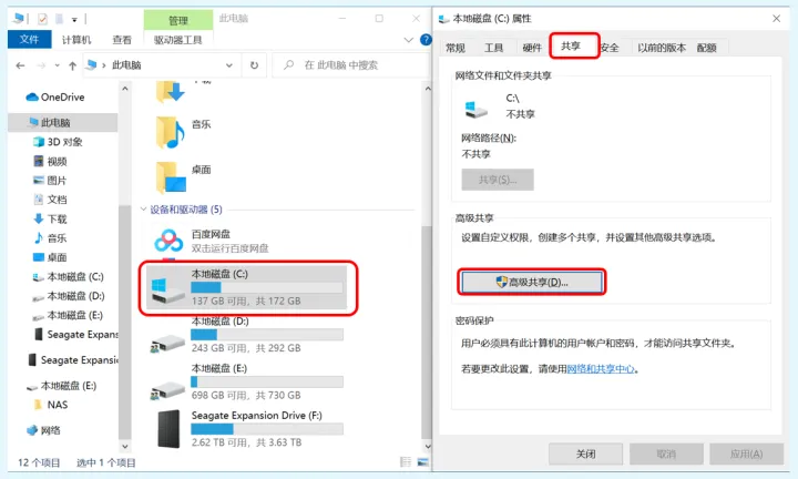 右键单击想要被共享的磁盘,然后在弹出菜单中选择最下方的“属性”。在属性中,点击最上方的“共享”选项卡,然后点击“高级共享”。