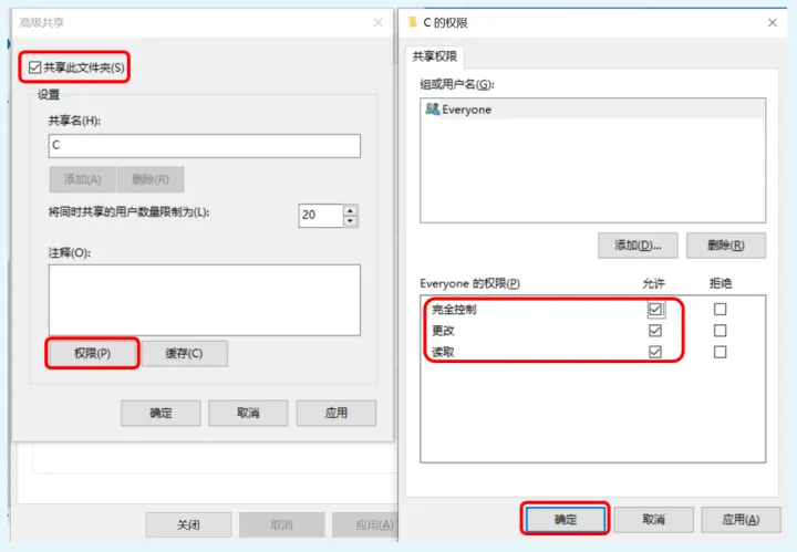 在高级共享中,将“共享此文件夹”前打钩,然后点击下方“权限”。在权限设置中,将everyone的三项权限“允许”全部打钩,然后确定,退出。