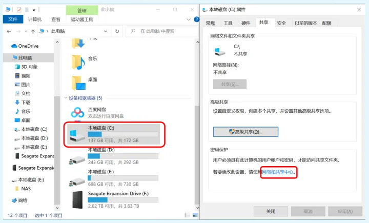 回到磁盘属性页面中,这次我们再点击最下方的“网络和共享中心”。