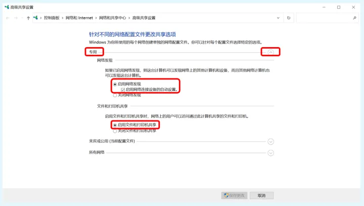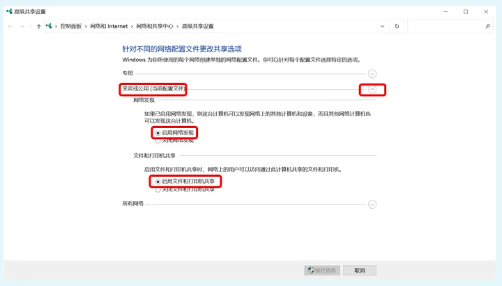 "专用"菜单设置完毕后,我们再展开”来宾或公用“菜单,然后将”启用网络发现“和”启用文件和打印机共享“都选中。