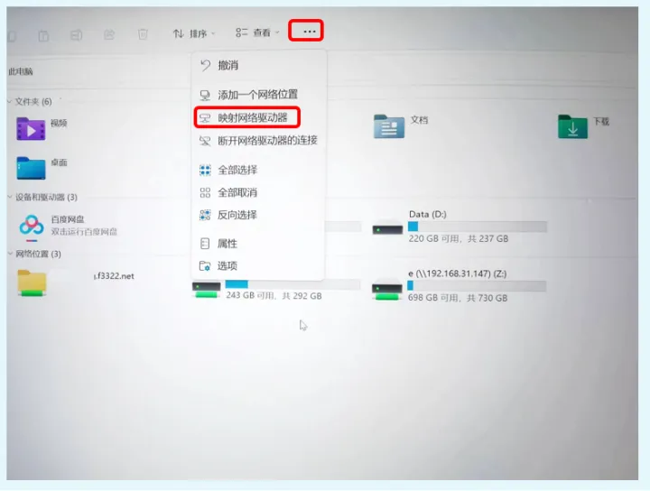 打开需要访问nas共享盘的“此电脑”——点击最上方的三个点,然后在弹出的菜单中点击“映射网络驱动器”,如下: