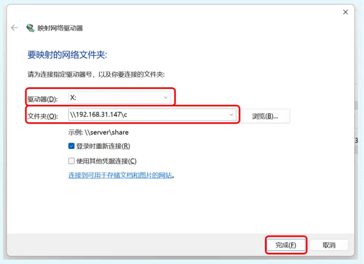 在映射网络驱动器窗口中,我们随便选择一个喜欢的驱动器盘符,然后在文件夹后面的文本框中填写“\\nas主机ip地址\盘符”即可。比如我这里,nas主机的内网ip地址是192.168.31.147,共享盘是c盘,那么我就填写