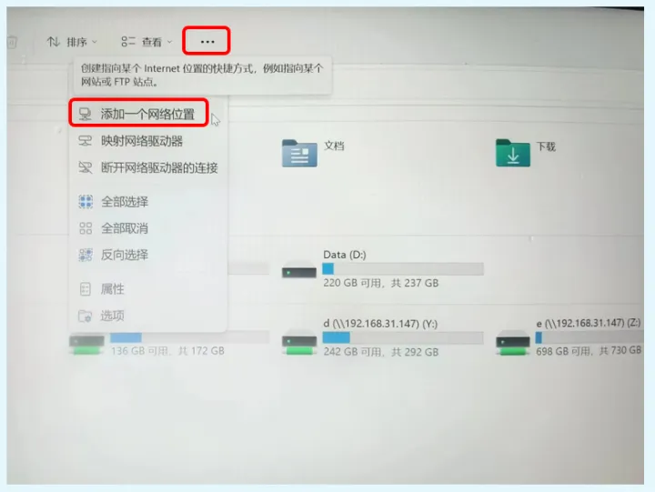 当完成防火墙手动放行后,就可以真正从外网访问nas主机的webdav共享文件夹了!我们现在转到需要访问nas共享文件夹的电脑,然后进入“此电脑”窗口,鼠标左键点击最上方“查看”右边的三个点,然后在弹出的菜单中点击“添加一个网络位置”。
