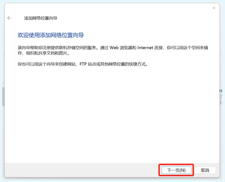 在添加网络位置向导中,我们直接点击“下一页”。