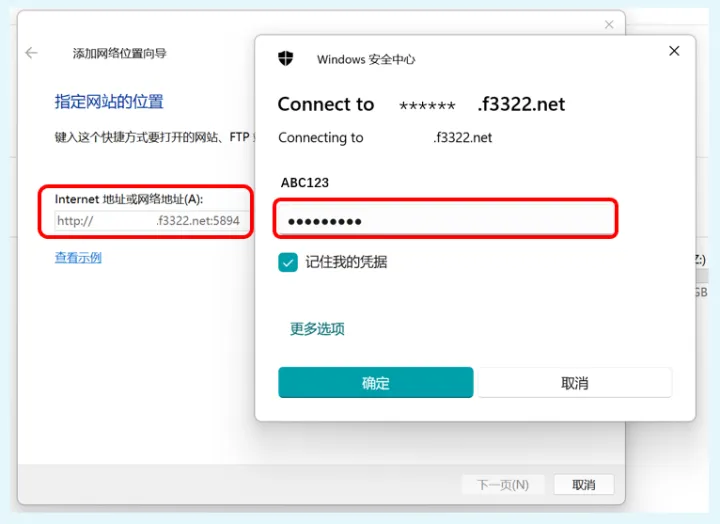 来到“指定网站的位置”页面,在“internet地址或网络地址”框中,填入nas主机的webdav共享服务公网地址和端口。由于我们设置的webdav采用http协议,在网址的前面需要加上http://,也就是http://******.http://f3322.net:5894。这里注意,http://是一定要加的,不加的话会报错。