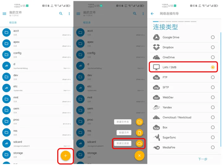 我们首先来设置局域网情况下的文件夹共享。打开solid explorer,点击右下角的黄色+号,然后点击“新建云连接”,在连接类型中选择“lan/smb”,然后下一步。