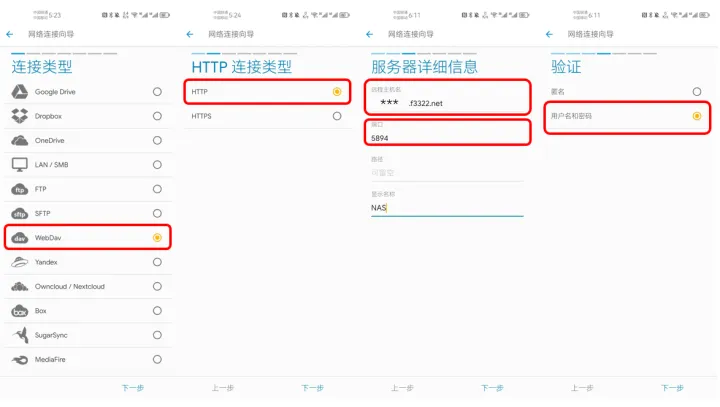 webdav的设置方式和smb类似,我们仍然在首页点击+新建云连接,但是在连接类型中选择webdav。接下来的http连接类型中,选择http,然后将nas主机的动态域名和外网端口号填入“服务器详细信息”页面。“路径”留空,“显示名称”可填可不填(填的话自己编一个喜欢的名字)。验证环节,仍然使用“用户名和密码”方式。