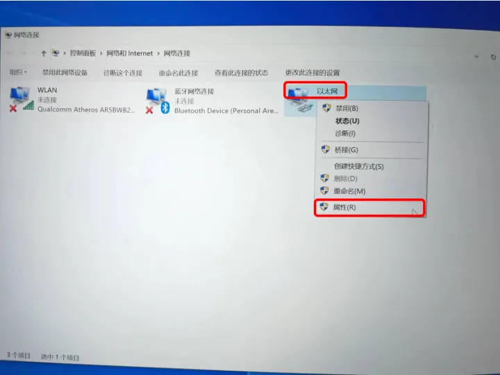 右键单击“以太网”,在弹出的菜单中选择“属性”。