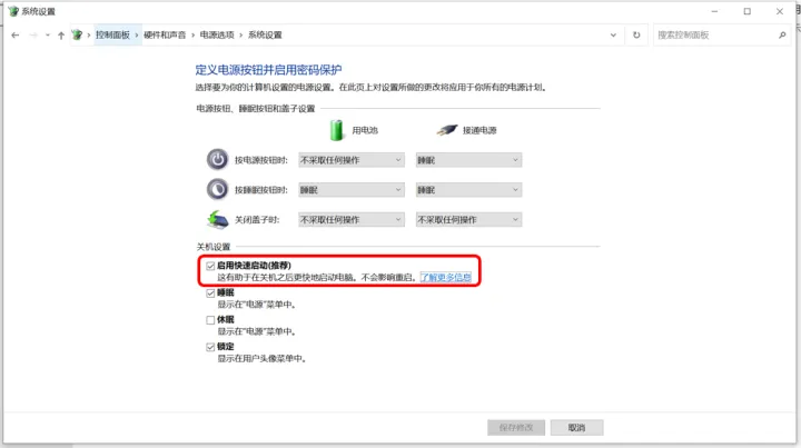 路径:控制面板→硬件和声音→电源选项→系统设置→关机设置→启用快速启动